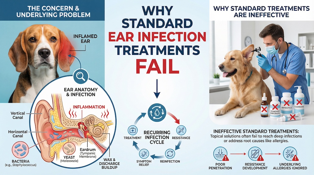 Here’s why standard dog ear infection treatment often fails: